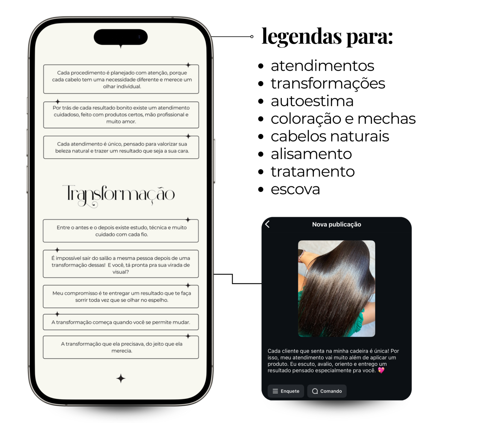 Gere temas de postagens, reels e stories em segundos, todos pensados para atrair clientes e valorizar o seu trabalho.